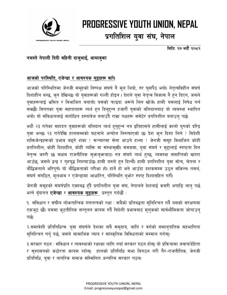 प्रगतिशिल युवा संघ नेपालले युवाहरूलाई अपिल गरेको छ । आन्दोलनलाई शान्तिपूर्ण र संवैधानिक बनाउनुहोस्। संघले जेन जिका प्रतिनिधिहरूसँग संवादको लागि तयार रहेको जनाएको छ। उनीहरूका मागहरूलाई नीतिगत रूपमा समेटेर अन्तरिम सरकार गठनको प्रक्रियामा पनि सहभागिता जनाउन सकिन्छ, तर संविधानभित्रै रहँदै।