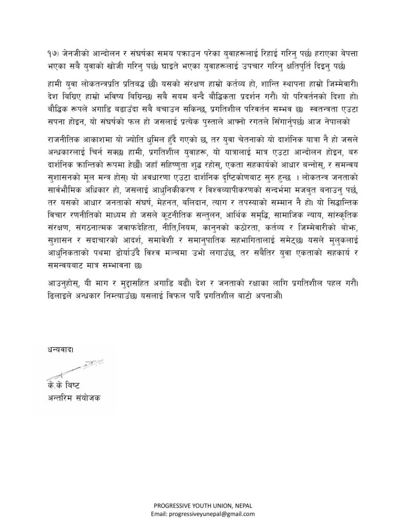 अन्तमा, प्रगतिशिल युवा संघ नेपालको यो धारणा नेपालको लोकतन्त्रलाई मजबुत बनाउने प्रयास हो। जेन जिका ऊर्जा र उत्साहलाई सही दिशामा मोडेर देशको विकासमा योगदान दिन सकिन्छ। यदि हामी सबै संवैधानिक मार्ग अपनायौं भने, नेपालको भविष्य उज्ज्वल हुनेछ। युवाहरूले हिंसा होइन, संवाद र कानुनी बाटो रोजौं , यही नै प्रगतिशीलताको सच्चा रूप हो।